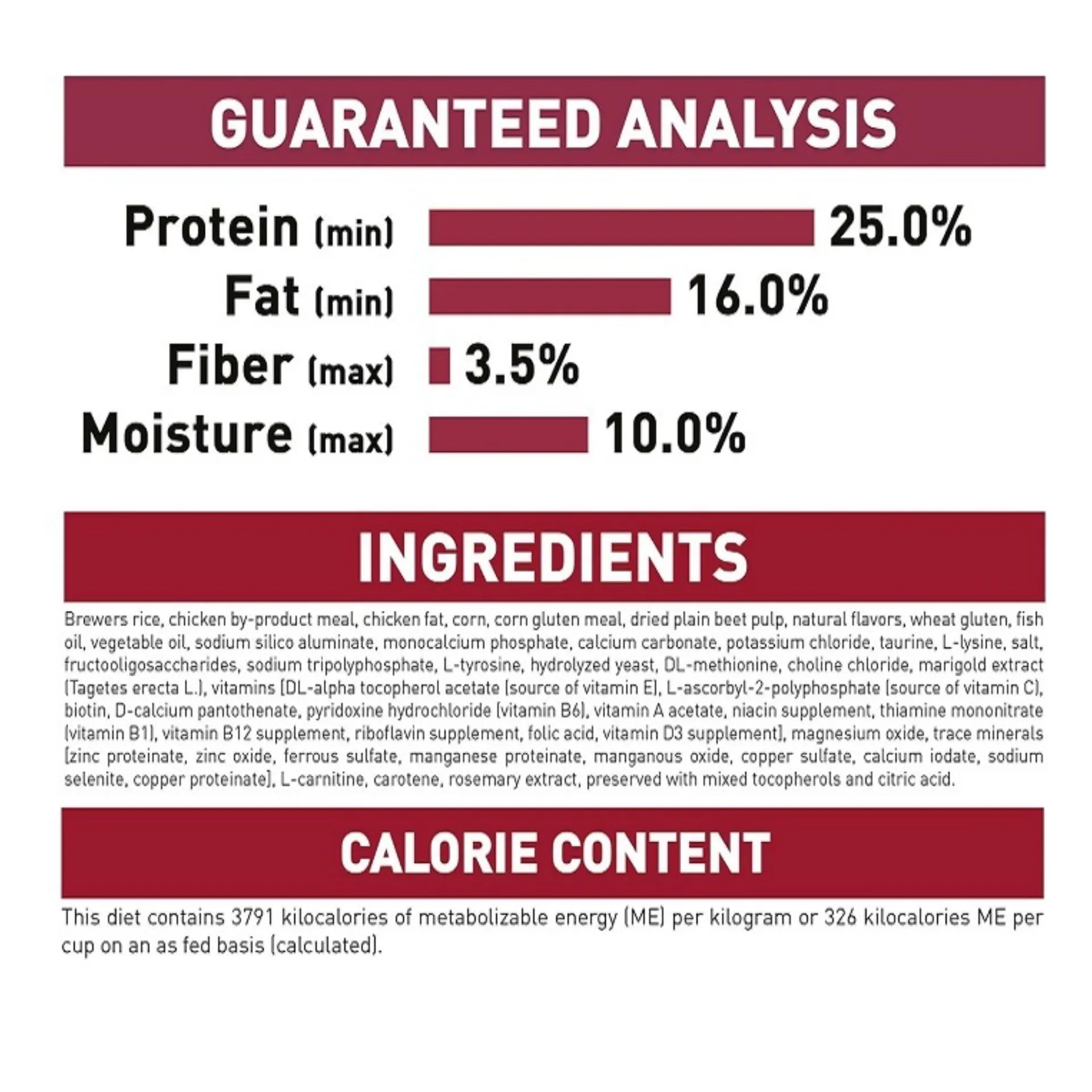 پروتئین مرغ خشک شده، برنج، چربی های حیوانی، ذرت، پروتئین گیاهی ایزوله شده، پروتئین های حیوانی هیدرولیز شده، الیاف گیاهی،تفاله چغندر، مخمرها و مشتقات آن، روغن ماهی، روغن سویا، مواد معدنی،پوسته و دانه های پسیلیوم 0/05%، فروکتو الیگو ساکاریدها، مخمرهیدرولیز شده (منبع بتاگلوکان ها)، روغن گل گاو زبان، عصاره گل همیشه بهار(منبع لوتئین)، ترکیبات نگهدارنده ، آنتی اکسیدان ها، انواع اسیدهای چربی ضروری امگا 3 و امگا 6، آهن، ید، منگنز، روی، D3، ویتامین A، پروتئین، فیبر و مواد معدنی |